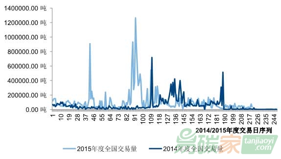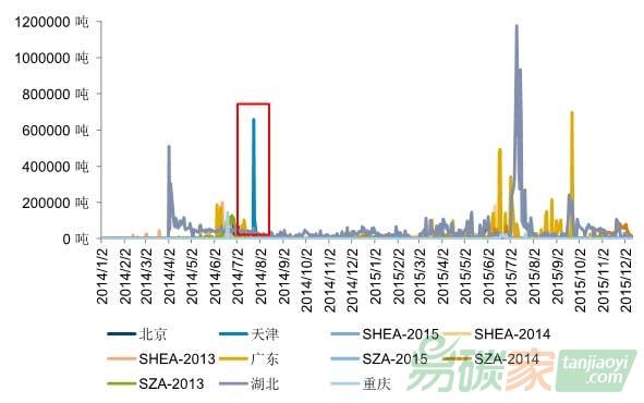 圖14:2014-2015年各交易試點當日交易量(噸)