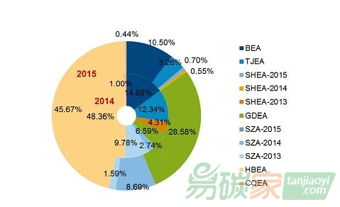對比7個碳交易試點兩個年度的各自交易情況,如圖3-2,可以發(fā)現(xiàn)變化最大的是廣東碳市場。2015年度廣東碳市場交易總量占全國總交易量的27%,而在2014年度該值僅為6%,份額的來源