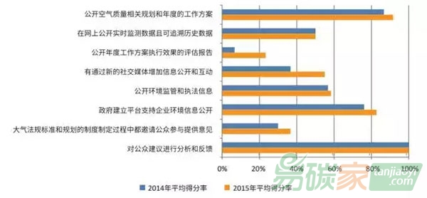 信息公開:公開年度工作方案執(zhí)行效果的省市明顯增多,超半數(shù)的省市主動通過新媒體進(jìn)行信息公開與互動,不過省市在公開歷史可追溯空氣質(zhì)量數(shù)據(jù)方面進(jìn)展緩慢。