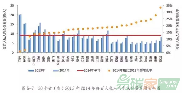 安徽2013年的單位面積煤炭消耗量分別位于全國第1、3、8和12位,這4個省(市)聚集形成一個高耗煤區(qū)域,給長三角地區(qū)的空氣質(zhì)量帶來了很大挑戰(zhàn)。30個省(市)2014年每百人私人汽車保有量的平均值為9.06輛,較2013年增長約17%,機(jī)動車污染控制壓力空前。