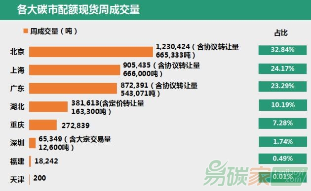 北京6月5日協(xié)議轉(zhuǎn)讓額)。其中,上海碳市配額現(xiàn)貨交易明顯活躍,周成交量(905,435噸)較前一交易周(9,519噸)大幅攀升;天津碳市時隔兩個半月后再現(xiàn)配額交易。各大碳市配額現(xiàn)貨交易情況請見下表: