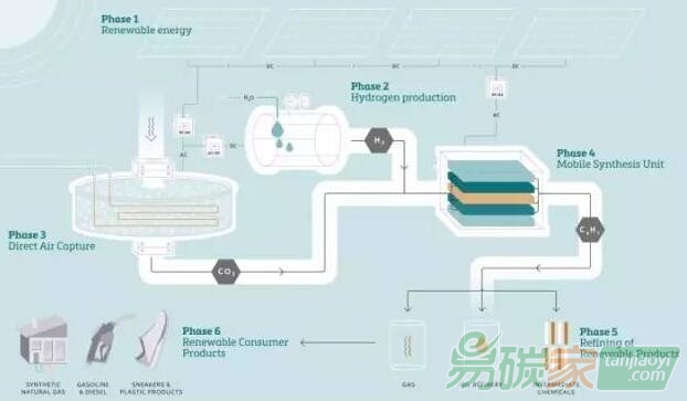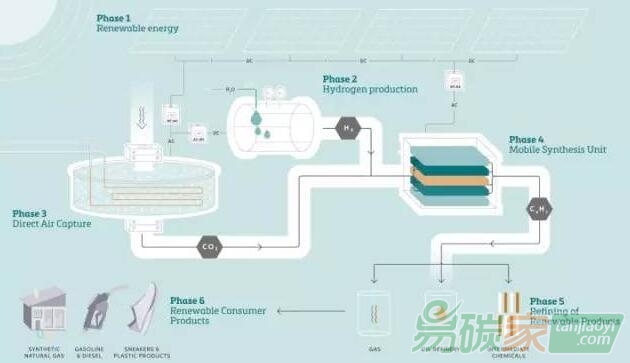 演示工廠包括四個獨立的單元:一個太陽能發(fā)電廠 ; 從空氣中分離二氧化碳和水的設(shè)備; 使用電解產(chǎn)生氫的部分; 以及用于從二氧化碳和氫氣生產(chǎn)原油替代物的合成設(shè)備。