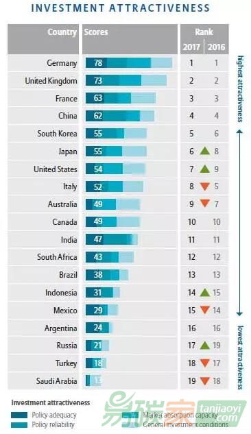 德國、英國和法國在2017年調(diào)查中仍然保持領(lǐng)先地位。因?yàn)樗麄兙邆浞€(wěn)定、支持的政策環(huán)境,同時(shí)還具備G20成員國中最佳的可再生能源發(fā)展經(jīng)驗(yàn)(即市場成熟度)和優(yōu)良的投資環(huán)境。