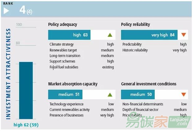 法國和德國是迄今為止(至2017年5月)向聯(lián)合國提交長期溫室氣體排放發(fā)展戰(zhàn)略的唯一兩個(gè)歐盟國家。相比而言,英國缺乏類似長期政策的穩(wěn)定性。英國2016年政策吸引力得分下降最大,但由于其在可再生能源產(chǎn)業(yè)的持續(xù)投入,使其保持了總體吸引力排名。英國承諾的可再生能源目標(biāo)(可再生能源發(fā)電占30%)在2020年結(jié)束,不清楚英國退歐后政府是否還會支持可再生能源和氣候變化。