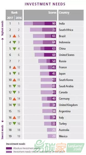 2016年調(diào)查結(jié)果再次表明,為建立一個(gè)與巴黎協(xié)定兼容的、具有氣候彈性的電力基礎(chǔ)設(shè)施,新興經(jīng)濟(jì)體對中等期限內(nèi)的投資需求更高。巴西、印度、南非和印度尼西亞成為投資高需求的熱點(diǎn)國家。安聯(lián)對投資需求提出了三個(gè)要素:能源需求增加,國家的規(guī)模,以及現(xiàn)有電力系統(tǒng)對氣候變化的脆弱性,而這些國家在這三個(gè)要素中都排名靠前。