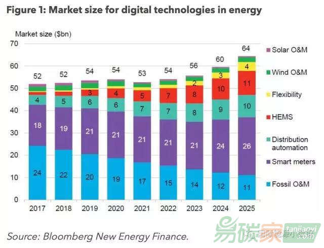 根據(jù)彭博新能源財(cái)經(jīng)(BNEF)的數(shù)據(jù)。數(shù)字技術(shù)(digital technologies)在能源領(lǐng)域應(yīng)用廣泛,2017年的