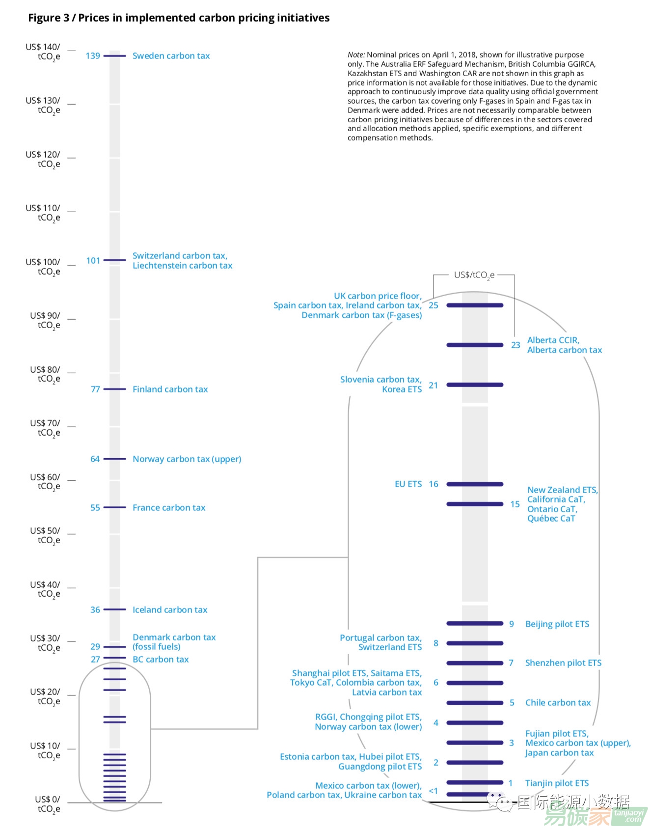 全球范圍內(nèi)碳價(jià)的區(qū)間在低于1美元/噸到139美元/噸之間,總起來(lái)說(shuō),碳價(jià)較高的國(guó)家均實(shí)施碳稅,而碳價(jià)較低的國(guó)家和地區(qū)則是碳交易市場(chǎng)(碳價(jià)低于10美元/噸的區(qū)域涵蓋46%的碳排放)。碳價(jià)從高到低的國(guó)家和地方如下——
