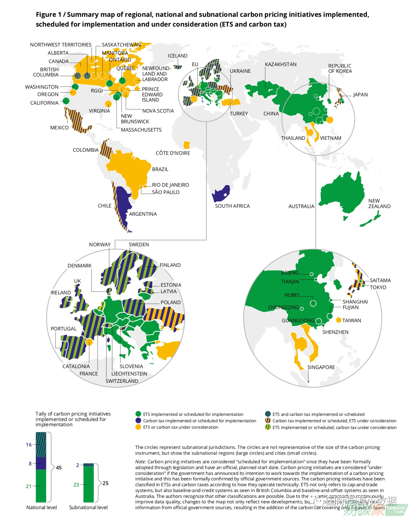 根據(jù)世界銀行最新發(fā)布的數(shù)據(jù),到目前止已經(jīng)有45個(gè)國(guó)家、25個(gè)國(guó)內(nèi)地方(如州、?。?shí)行了碳價(jià)機(jī)制(