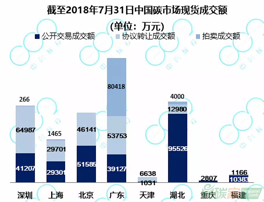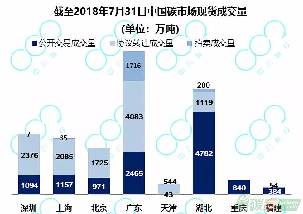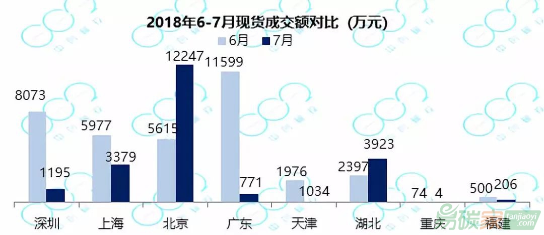 截至2018年7月31日,一、二級現(xiàn)貨市場累計(jì)成交2.57億噸,成交額57.25億元。廣東、湖北成交量最高,位于第一梯隊(duì);深圳、上海、北京位于第二梯隊(duì);而天津、重慶、福建的成交量相對較低,位于第三梯隊(duì)。