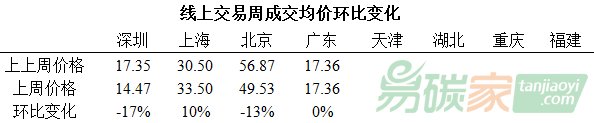 福建市場(chǎng)無(wú)成交。 在近兩周發(fā)生連續(xù)交易的市場(chǎng)內(nèi),各配額市場(chǎng)的價(jià)格走勢(shì)繼續(xù)保持平穩(wěn),價(jià)格浮動(dòng)范圍均不超過20%,其中廣東的表現(xiàn)最為穩(wěn)定,成交價(jià)格與前一周保持一致,深圳、北京、湖北和重慶的平均成交價(jià)格有所回落,僅上海的成交價(jià)格略有上浮,漲幅為10%。