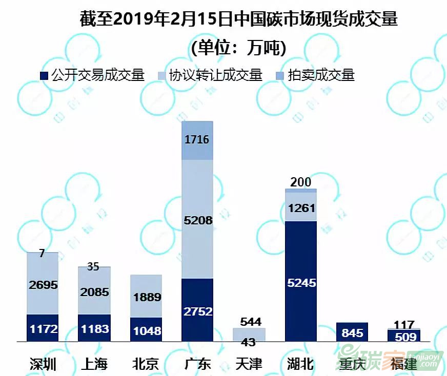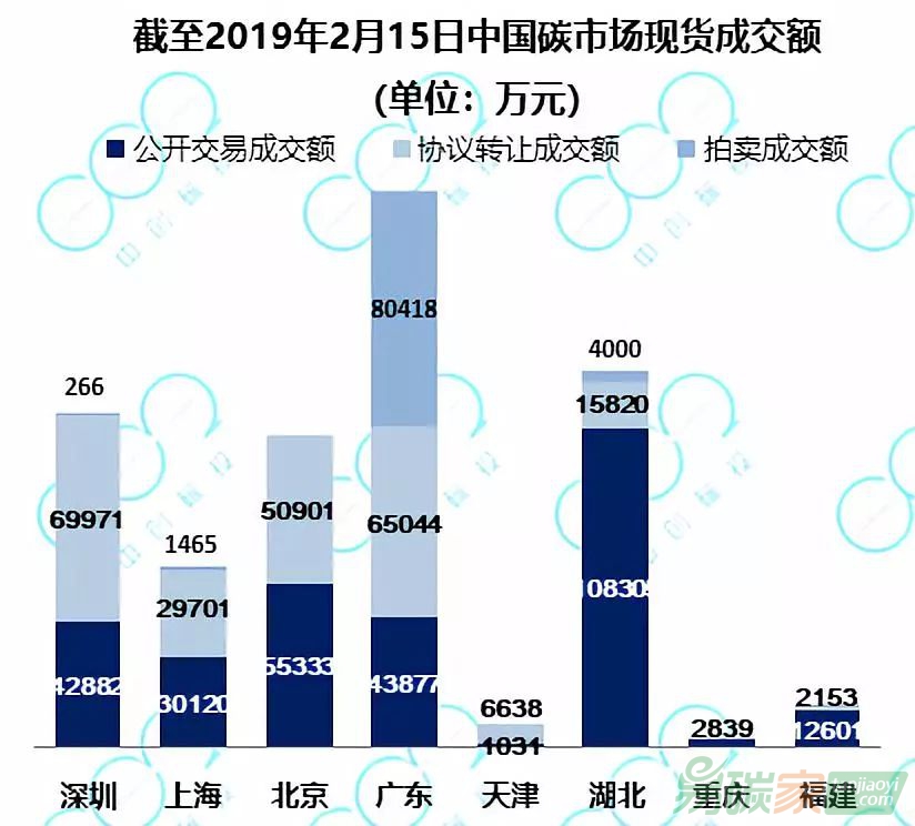 北京、重慶市場(chǎng)上周尚未恢復(fù)交易。上周,廣東市場(chǎng)表現(xiàn)相對(duì)活躍,成交8.4萬(wàn)噸,成交額155萬(wàn)元,對(duì)各市場(chǎng)總成交的貢獻(xiàn)均超過(guò)60%。深圳成交4.4萬(wàn)噸,成交額64萬(wàn)元;湖北成交8500余噸,成交額24萬(wàn)元。 截至2019年2月15日,8個(gè)區(qū)域碳市場(chǎng)一、二級(jí)現(xiàn)貨市場(chǎng)累計(jì)成交2.86億噸,總成交額62.36億元。廣東、湖北成交量最高,位于第一梯隊(duì);深圳、上海、北京位于第二梯隊(duì);而天津、重慶、福建的成交量相對(duì)較低,位于第三梯隊(duì)。