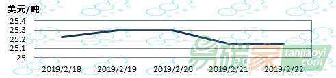 新西蘭碳市場(chǎng)2019年02月18日至2019年02月24日,新西蘭碳市場(chǎng)價(jià)格在25.05-25.30美元/噸之間波動(dòng)。