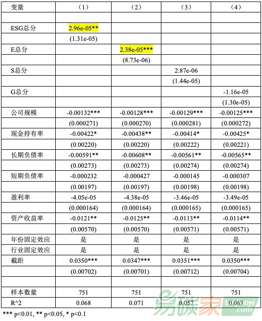 由表1可以看出,企業(yè)ESG總體表現(xiàn)與企業(yè)創(chuàng)新呈正相關(guān)且顯著水平達到1%,說明企業(yè)ESG總體表現(xiàn)好的企業(yè)有更高的創(chuàng)新能力。如果分別從環(huán)境、社會和治理三個維度進行實證,結(jié)果顯示:環(huán)境表現(xiàn)與企業(yè)的創(chuàng)新呈現(xiàn)顯著正相關(guān),因此,企業(yè)的環(huán)境表現(xiàn)較好的企業(yè)創(chuàng)新能力更強。
