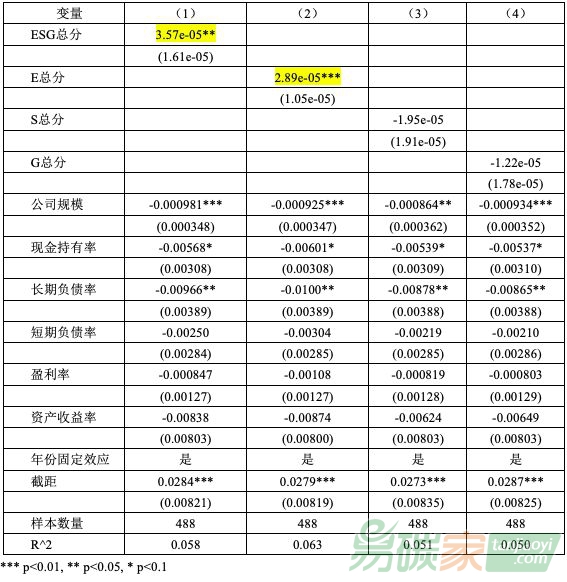 將總樣本分成制造業(yè)、服務(wù)業(yè)和金融業(yè),得到制造業(yè)樣本488個。表2顯示在制造業(yè)中,企業(yè)ESG總體表現(xiàn)與企業(yè)創(chuàng)新顯著正相關(guān),顯著水平達到1%,因此,企業(yè)ESG總體表現(xiàn)好的企業(yè)創(chuàng)新能力更強。如果分別從環(huán)境(E),社會(S)和治理(S)三個維度展開實證,制造業(yè)企業(yè)的環(huán)境總分與企業(yè)的創(chuàng)新能力呈現(xiàn)顯著正相關(guān),因此,提升制造業(yè)企業(yè)的環(huán)境表現(xiàn)能顯著促進企業(yè)的創(chuàng)新。
