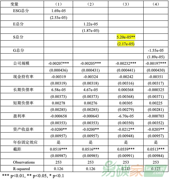 本文對服務(wù)業(yè)253個樣本展開實證研究(如下表3),結(jié)果顯示:在服務(wù)業(yè)中,社會表現(xiàn)總分與企業(yè)創(chuàng)新呈現(xiàn)正相關(guān),且顯著水平達到5%。因此,對于服務(wù)業(yè)企業(yè)而言,提升社會表現(xiàn)能顯著提升企業(yè)的創(chuàng)新。