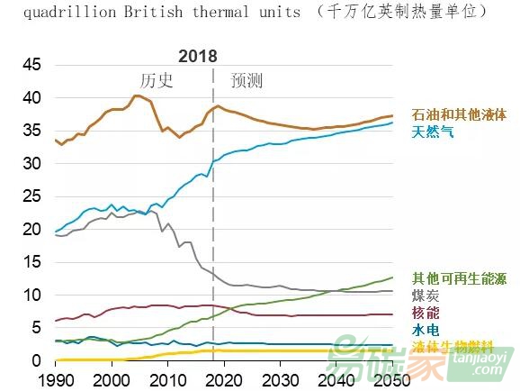 圖1: 美國(guó)能源消費(fèi)構(gòu)成 (2018年之后為基本情景預(yù)測(cè))