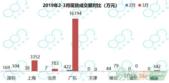 2019年3月,二級(jí)市場(chǎng)成交量和交易額較2019年2月有大幅上漲,共計(jì)成交978.6萬(wàn)噸,實(shí)現(xiàn)交易額2.1億元,均較前一月擴(kuò)大了約30倍,其主要貢獻(xiàn)來(lái)自于廣東市場(chǎng)。