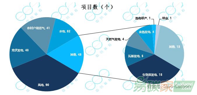 減排量備案項(xiàng)目287個(gè)。獲得減排量備案的項(xiàng)目中掛網(wǎng)公示254個(gè),合計(jì)備案減排量5283萬(wàn)噸CO2e。從項(xiàng)目類(lèi)別看,已獲得減排量備案且材料公示的254個(gè)項(xiàng)目中,有第一類(lèi)項(xiàng)目139個(gè),合計(jì)備案減排量1890萬(wàn)噸CO2e;第二類(lèi)項(xiàng)目17個(gè),備案減排量372萬(wàn)噸CO2e;第三類(lèi)項(xiàng)目98個(gè),備案減排量3031萬(wàn)噸CO2e。從項(xiàng)目類(lèi)型看,風(fēng)電、光伏、農(nóng)村戶(hù)用沼氣、水電等項(xiàng)目較多,詳細(xì)情況如下圖所示: