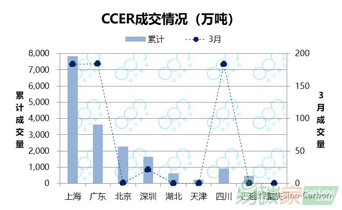 四川CCER均有成交,累計(jì)成交量573.46萬(wàn)噸,較2月(83.08萬(wàn)噸)擴(kuò)大了近6倍。