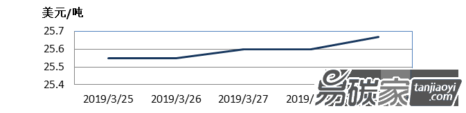 新西蘭碳市場2019年03月25日至2019年03月31日,新西蘭碳市場價(jià)格在25.55-25.67美元/噸之間波動(dòng)。