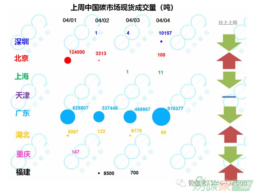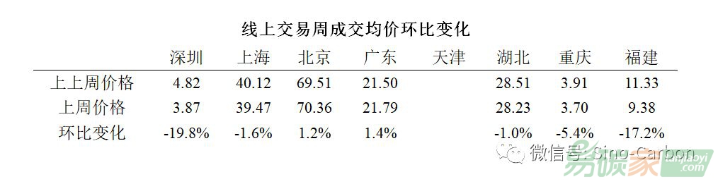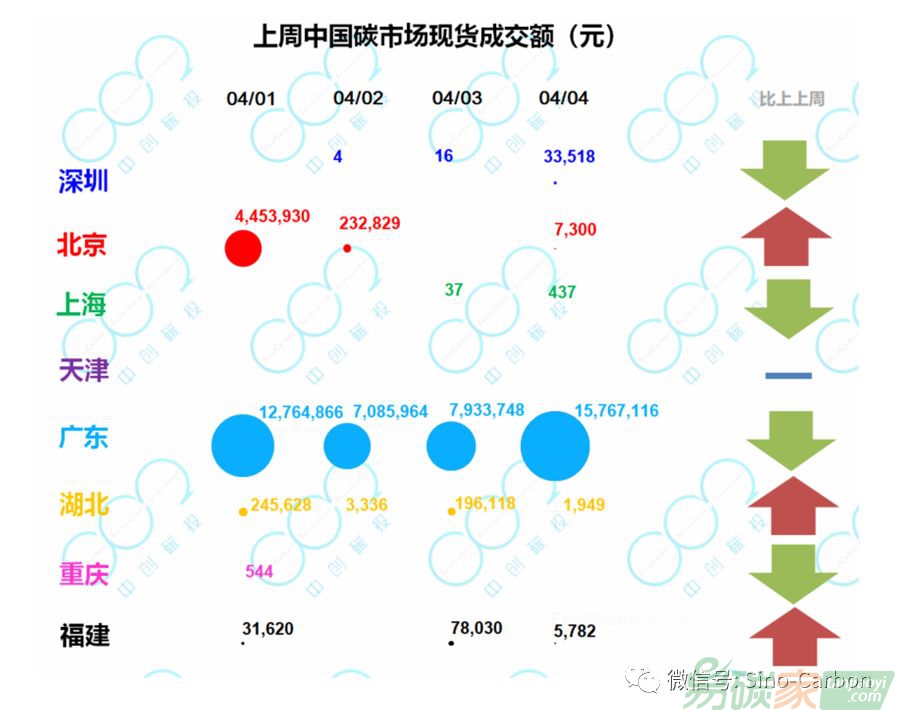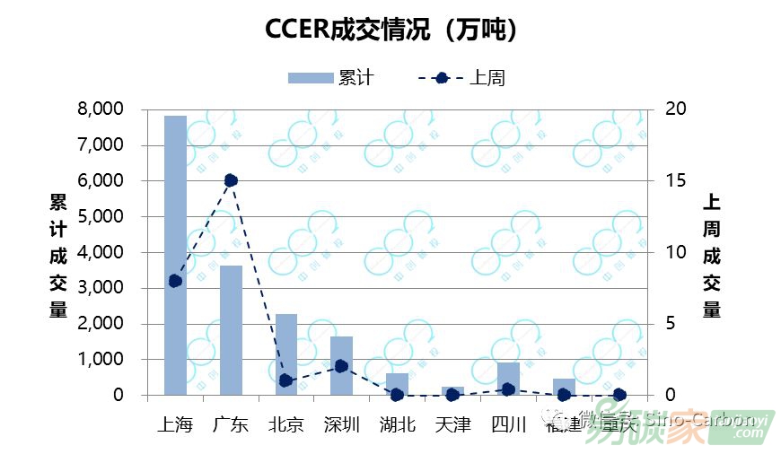 碳市場一、二級配額現(xiàn)貨市場共計成交250.8萬噸,總成交額4884.3萬元,均較前一周(415.8萬噸,8321.1萬元)下降了40%左右。其中廣東市場的貢獻(xiàn)最大:上周實現(xiàn)交易234.5萬噸,成交額4355.2萬元,在各試點總成交中占比均超過90%。在連續(xù)兩周發(fā)生交易的區(qū)域市場中,除廣東的成交量和成交額均下降了40%左右之外,深圳、上海、重慶上周交易較前一周也有所下降。其中,深圳市場上周成交1萬噸,成交額3.4萬元,較前一周分別下降了86%和97%;上海市場上周成交12噸,成交額474元,較前一周降幅達(dá)100%;重慶上周成交147噸,成交額544元,均較前一周下降了86%左右。北京、湖北、福建上周的成交量和成交額較前一周有所上漲,其中北京市場漲幅最為明顯,實現(xiàn)交易12.7萬噸,成交額469.4萬元,分別約為前一周的20倍和10倍。上周天津市場無成交。