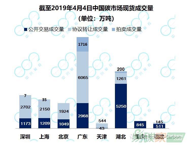 截至2019年4月4日,8個區(qū)域碳市場一、二級現(xiàn)貨市場累計成交2.98億噸,總成交額64.96億元。廣東、湖北成交量最高,位于第一梯隊;深圳、上海、北京位于第二梯隊;而天津、重慶、福建的成交量相對較低,位于第三梯隊。