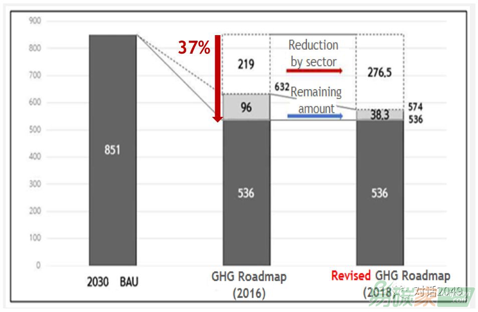 2015年,韓國確定了國家自主貢獻(INDC),要在2030年實現(xiàn)溫室氣體排放量和常規(guī)情景(business-as-usual)相比降低37%。我們在2016年制定了溫室氣體減排路線圖,并在2018年修訂了個別行業(yè)部門的目標(biāo),比如國內(nèi)從25.7%調(diào)整到32.5%。