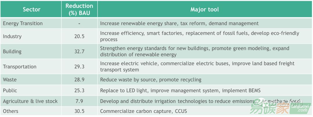 如上圖,韓國政府也制定了多個行業(yè)部門的減排目標(biāo)和舉措。