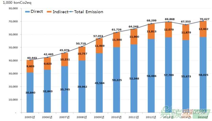 從1990年到2015年,我們一直在跟蹤韓國溫室氣體排放情況,2015年全國溫室氣體排放總量與20世紀90年代相比增加了135%,與2014年相比增加了0.2%。自2013年開始,總體排放緩慢下降。
