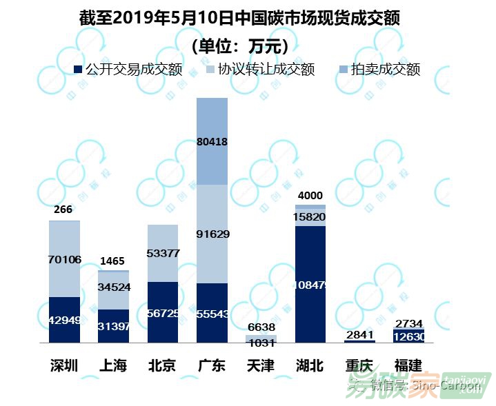 截至2019年5月10日,8個區(qū)域碳市場一、二級現(xiàn)貨市場累計成交3.08億噸,總成交額67.28億元。廣東、湖北成交量最高,位于第一梯隊;深圳、上海、北京位于第二梯隊;而天津、重慶、福建的成交量相對較低,位于第三梯隊。