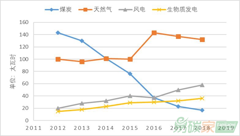 從下圖1 可看出,自2013年英國實行碳稅以來,碳稅對煤電廠造成巨大沖擊。煤電廠的發(fā)電量從2012年的143太千瓦一路跌至2018年的17太千瓦,下降了近9倍,降速驚人。而溫室氣體排放量較低的天然氣發(fā)電以及風力和生物質(zhì)等清潔能源發(fā)電卻在碳稅的作用下迎來一波迅猛增長。尤其是天然氣發(fā)電,在2014年以后取代煤電,成為了英國電力最大的供應部分,同時風力發(fā)電從2012年的20太瓦時增至2018年的58太瓦時,增幅近2倍。2017年后,英國的天然氣發(fā)電、風力發(fā)電、生物質(zhì)能發(fā)電體量均已經(jīng)超過火電。