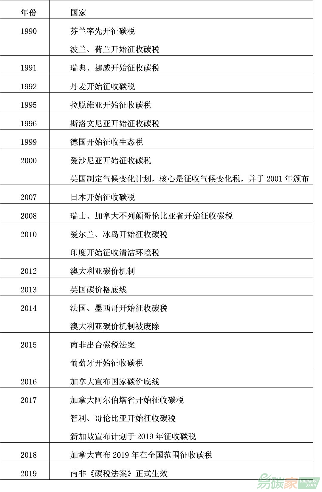 芬蘭是全球首征碳稅的國家。1990年,芬蘭政府對化石燃料按碳含量征收1.62美元/tCO2的碳稅,而后芬蘭在1997年和2011年分別進行了稅制改革,納入更多征稅對象以及采用更科學的征稅方法。現(xiàn)在芬蘭碳稅征稅對象包括汽油、柴油、輕質(zhì)燃油、重質(zhì)燃料油、航空煤油、航空汽油、煤炭和天然氣等。碳稅被認為是芬蘭發(fā)展低碳經(jīng)濟最重要的手段之一。目前包括加拿大、澳大利亞、英國、美國等20多個國家均有實施碳稅。各國開始征收碳稅的時間如下表所示: