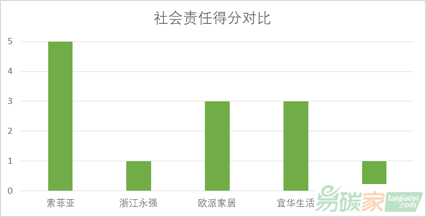 社會責(zé)任方面,宜華生活在家居用品行業(yè)中處于中等水平。宜華生活在社會責(zé)任板塊得分占其ESG綜合得分的40%,由此也可以看出宜華生活對于自身承擔(dān)社會責(zé)任的重視程度。根據(jù)2018年宜華生活財(cái)務(wù)報(bào)表相關(guān)附錄信息披露,該公司長期以來積極投身于社會公益事業(yè)。