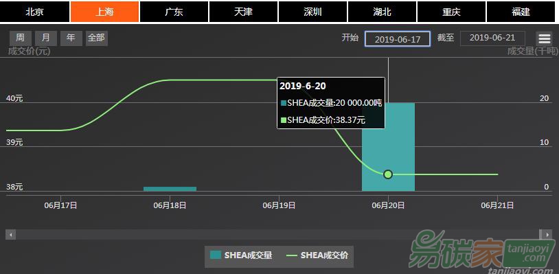 6月17日至6月21日,上海碳配額(SHEA)現(xiàn)貨線上累計成交21,000噸,較上周有所下降,協(xié)議轉(zhuǎn)讓無成交。本周,SHEA市場整體活躍度不高,量價呈現(xiàn)齊跌現(xiàn)象;從成交上看,僅周二、周四有交易達(dá)成。收盤價方面,SHEA價格雖然在周二重新站上40.50元/噸的高位,但隨后下滑走低,周四報收38.37元/噸,并維持至周五收盤,較上周五同比下跌0.99元/噸。