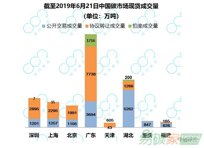 截至2019年6月21日,8個區(qū)域碳市場一、二級現(xiàn)貨市場累計成交3.30億噸,總成交額71.56億元。廣東、湖北成交量最高,位于第一梯隊;深圳、上海、北京位于第二梯隊;而天津、重慶、福建的成交量相對較低,位于第三梯隊。