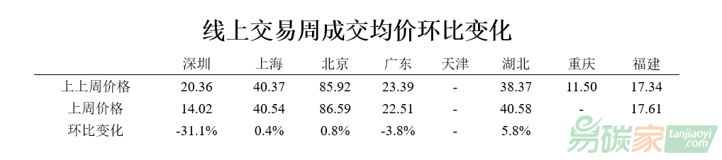 在連續(xù)兩周發(fā)生交易的區(qū)域市場中,深圳市場的價格變動幅度最大,較前一周下跌了31%;湖北成交均價較前一周略有上漲;其他地區(qū)市場價格表現(xiàn)穩(wěn)定,線上交易平均價格與前一周持平。