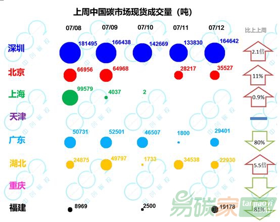 2019年7月8日-7月12日,湖北CCER市場表現(xiàn)最為活躍,共計(jì)成交4.4萬噸;其次為上海和