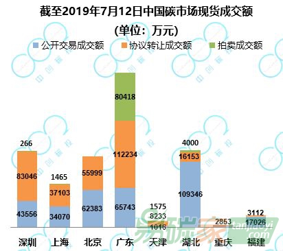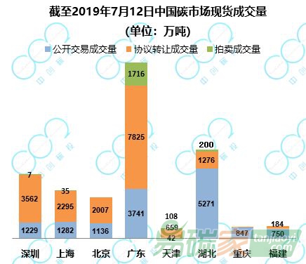 截至2019年7月12日,8個區(qū)域碳市場一、二級現(xiàn)貨市場累計(jì)成交3.42億噸,總成交額73.98億元。廣東、湖北成交量最高,位于第一梯隊(duì);深圳、上海、北京位于第二梯隊(duì);而天津、重慶、福建的成交量相對較低,位于第三梯隊(duì)。