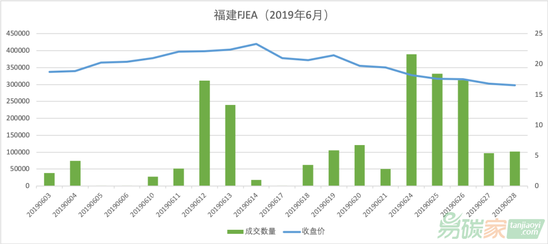 福建碳市場(chǎng)均價(jià)小幅度回落,其余碳市場(chǎng)配額均價(jià)持平。