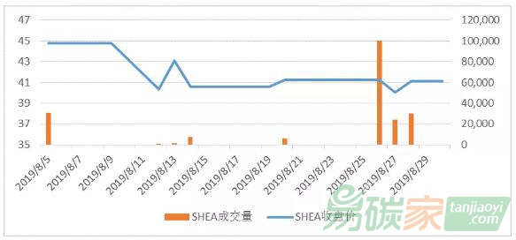本周,SHEA現(xiàn)貨市場活躍度回升。隨著2018年控排企業(yè)配額清繳履約期預期臨近,周一至周三連續(xù)三日有交易達成,其中周一協(xié)議轉(zhuǎn)讓成交100,000噸。收盤價方面,SHEA價格圍繞40元/噸水平窄幅波動,周二下探40.06元/噸,后上揚并維持至周五收盤,報收41.12元/噸,較上周五環(huán)比微跌0.13元/噸。