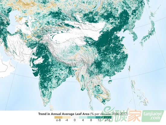 顏色深淺反映中國(guó)每10年植被平均增長(zhǎng)率,綠色為正(圖源:NASA)