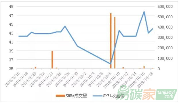 10月14日至10月18日,上海碳配額(SHEA)現(xiàn)貨線上累計成交33,758噸,較上周有所收縮,協(xié)議轉(zhuǎn)讓無成交,較上周顯著回落。本周,SHEA現(xiàn)貨市場雖不及節(jié)后首周表現(xiàn)亮眼,有多筆大單的協(xié)議轉(zhuǎn)讓成交,但是整體較為活躍,除周一以外每日均有交易達成。收盤價方面,SHEA價格先揚后抑,隨著前半周的步步高升,周三創(chuàng)下47.79元/噸歷史峰值,隨后回落,并于周五報收43.95元/噸,較上周環(huán)比上漲1.67元/噸。