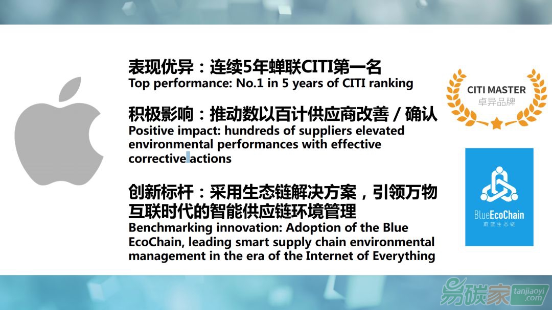 蘋果成為首個入選 “CITI卓異品牌”榜單的公司,該榜單的設立旨在推動品牌在供應鏈環(huán)境管理中與供應商構建更平等的伙伴關系,推動供應商更主動地承擔污染治理的主體責任。