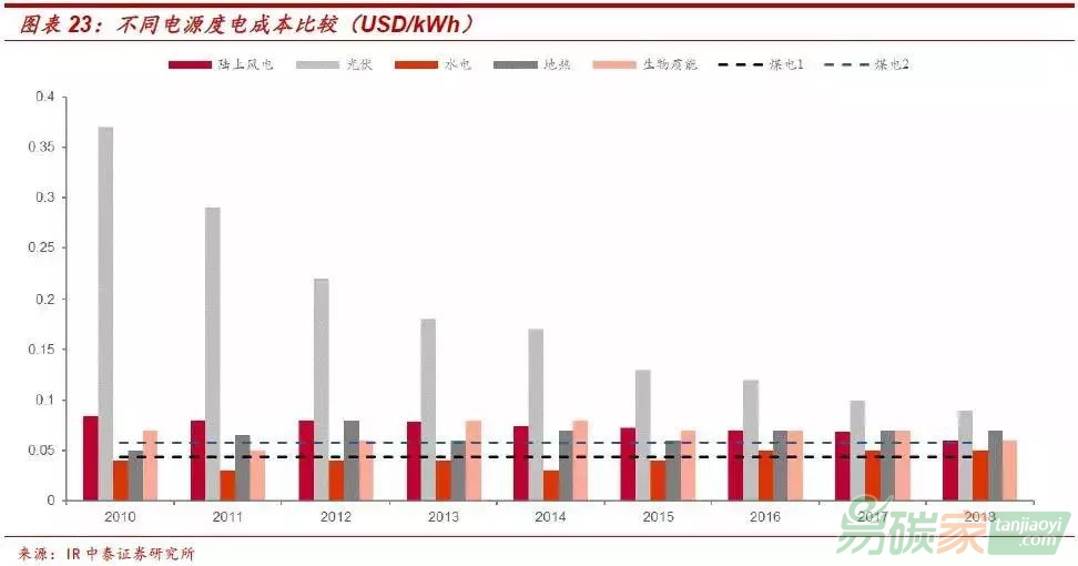 風(fēng)光有望成為成本最低的能源形式。目前光伏發(fā)電成本仍然較風(fēng)電較高,但光伏成本下降速度較快,同時(shí)風(fēng)電成本也在降低,因此可預(yù)期的未來(lái),光伏和風(fēng)電將成為比傳統(tǒng)能源成本更低的能源形式。