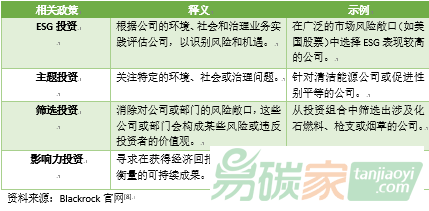6、 Blackrock黑石集團(tuán)的ESG投資政策主要分為引入指標(biāo)評(píng)估的ESG投資、ESG相關(guān)主題投資、降低ESG相關(guān)風(fēng)險(xiǎn)的篩選投資和專注于某一特殊領(lǐng)域的影響力投資。