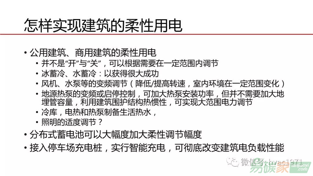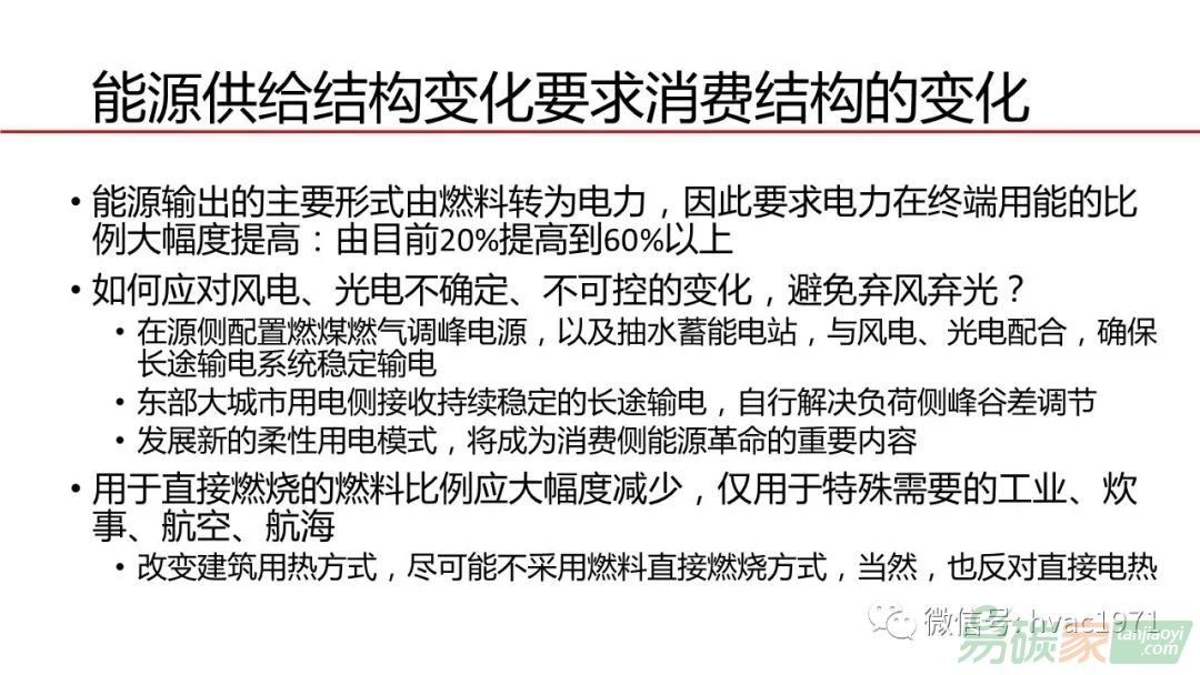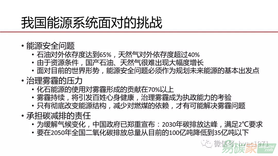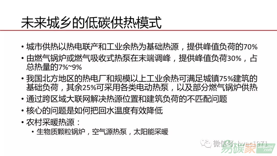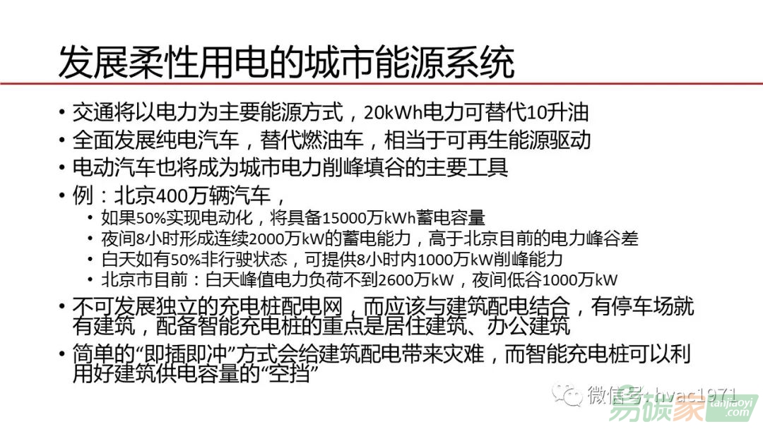 問(wèn)題。發(fā)展蓄能末端和柔性末端是實(shí)現(xiàn)低碳能源的關(guān)鍵,電動(dòng)汽車(chē)、智能充電樁、建筑直流配電和分布式蓄電、可中斷負(fù)載——這都應(yīng)該是能協(xié)助解決上述問(wèn)題的有效途徑。以熱電聯(lián)產(chǎn)和工業(yè)余熱為基礎(chǔ)熱源的跨區(qū)域熱網(wǎng)+末端調(diào)峰將成為北方城鎮(zhèn)供熱的主導(dǎo)方式。