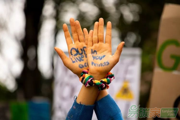 一名應(yīng)對氣候變化的支持者在手上寫有“Our lives are in your hands”字樣。