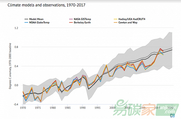 航空航天局、美國國家海洋和大氣管理局、HadCRUT、Cowtan and Way以及美國獨(dú)立研究機(jī)構(gòu)“伯克利地球” 圖片來源:Carbon Brief