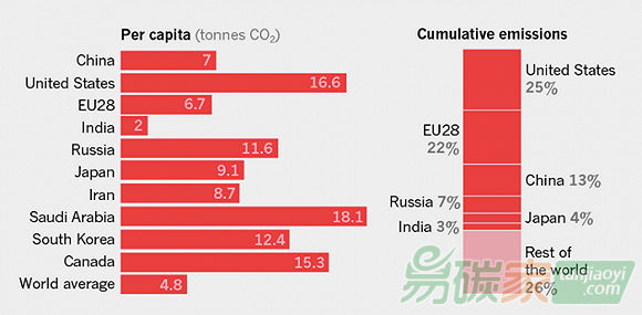 各國人均年二氧化碳排放量和總排放量。數(shù)據(jù)來自全球碳計劃組織 圖片來源:Nature