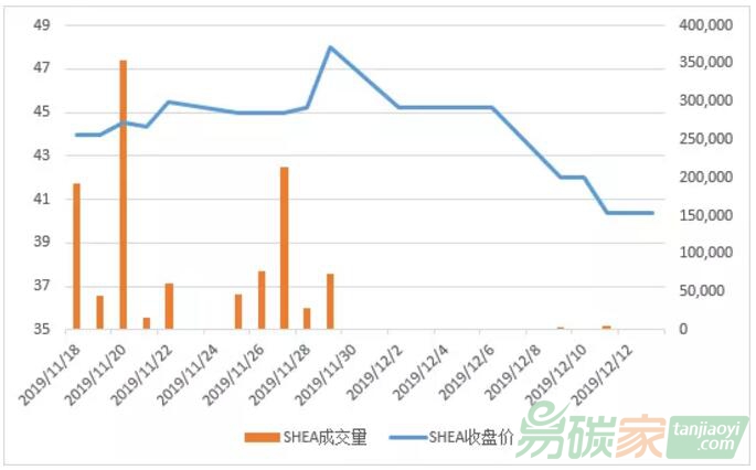 12月9日至12月13日,上海碳配額(SHEA)現(xiàn)貨線上成交9,498噸,較上周稍有擴張,協(xié)議轉(zhuǎn)讓無成交。本周,SHEA陸續(xù)出現(xiàn)小范圍成交,分別在周一、周三成交3,598噸及5,900噸。收盤價方面,SHEA價格在清繳履約期結(jié)束后小幅下挫,周一下跌至42元/噸,周五收盤報收40.35元/噸,較上周環(huán)比下跌4.87元/噸。